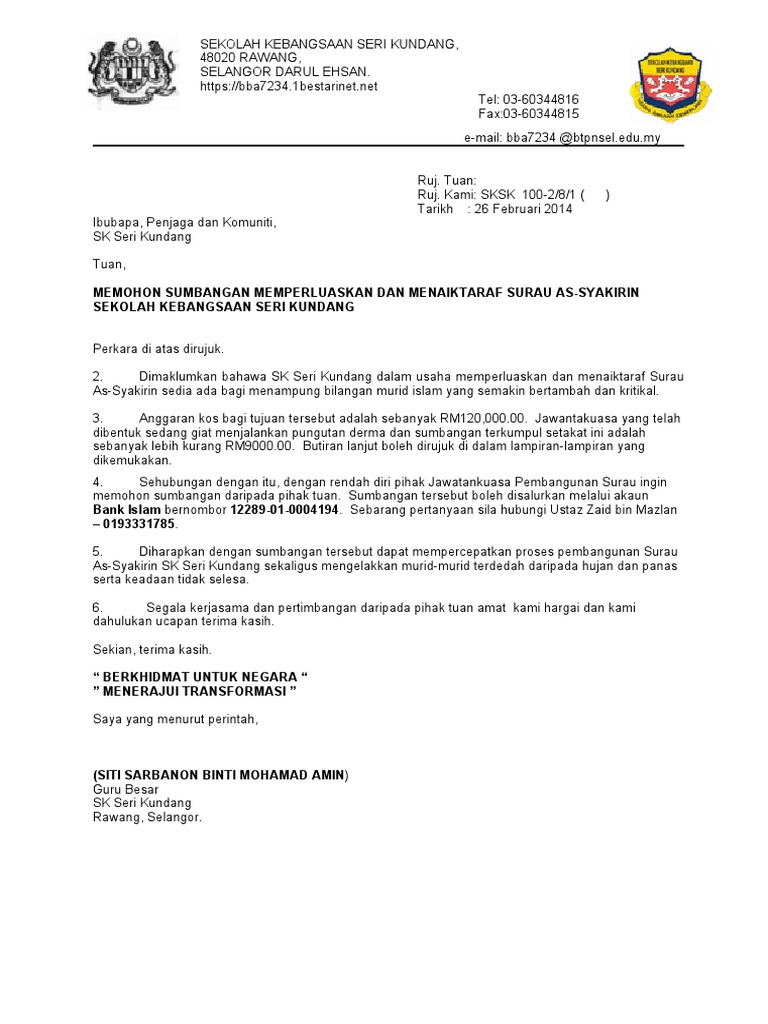 Memohon sumbangan untuk kerja menaiktaraf prasarana surau al-falah bandar tasik selatan kuala lumpur Dengan hormatnya kami bagi pihak kariah Surau Al-Falah Bandar Tasik Selatan Kuala Lumpur ingin memohon jasabaik YBhg Tan SriPuan SriDatoDatinTuanPuan agar dapat memberikan sedikit sumbangan kepada kami untuk. Acara tasyakuran ini biasanya diselenggarakan untuk merayakan pernikahan pembukaan rumah. Contoh surat rasmi memohon sumbangan wang surat rasmi 1 from i2wp sekiranya permohonan anda ditolak jangan putus asa.