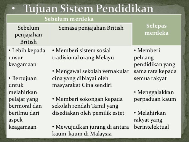 Semasa Zaman Kolonialisme Kerajaan Inggeris menggalakkan penubuhan sistem. SISTEM PENDIDIKAN MALAYSAI SELEPAS MERDEKALAPORANPENYATA RAZAKAntara tujuan utama laporan1.