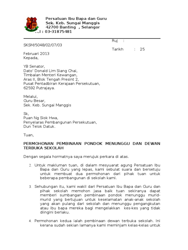 Contoh Surat Memohon Sumbangan Derma Pembangunan Surau. Surat Rasmi Mohon Peruntukan Dan Sumbangan. Itulah yang dapat kami bagikan terkait contoh surat permohonan bantuan dana pembangunan sekolah.